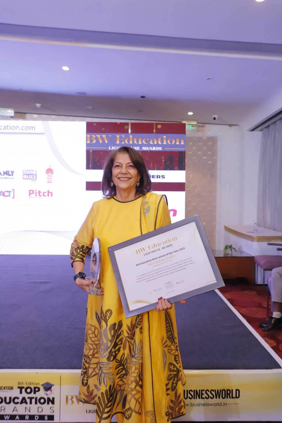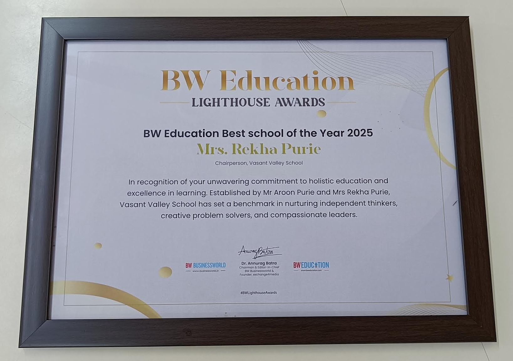 Mrs. Rekha Purie, Chairperson of Vasant Valley School, received the BW Education Best School of the Year 2025 award at the BW Education Lighthouse Awards.She dedicated the honour to her team for their unwavering commitment to nurturing young minds and fostering excellence in education.